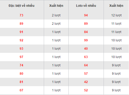 Theo quan sát bảng thống kê trên, ta thấy bộ số 94 đang tạm dẫn đầu với 12 lần xuất hiện, ngày về gần đây nhất vào 11/4/2016. Tiếp theo đó là 2 bộ số 89 và 84 đều sở hữu 11 lần về, ngày về gần nhất đều vào 21/3/2016. Có tới 3 bộ số đều có 10 lần góp mặt đó là các bộ số 99-40-63. Xếp chót bảng và đều có được 9 lần xuất hiện là các bộ số 64,57,42,52.