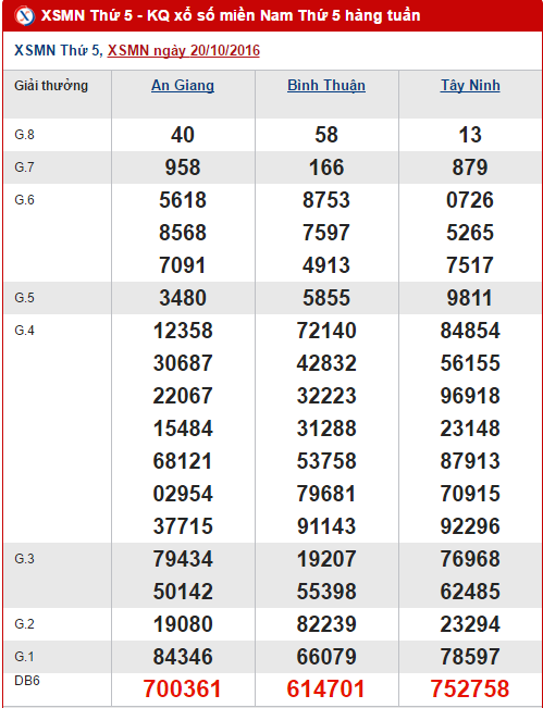 Xổ số miền Nam hôm nay mở thưởng lúc 16h20 chiều tại các tỉnh An Giang, Bình Thuận và Tây Ninh. Trước khi đến với kết quả quay thưởng, mời quý vị và các bạn cùng chúng tôi đi vào nội dung phân tích, thống kê kết quả XSMN trong 30 ngày quay gần nhất tính đến hôm nay 27/10/2016.