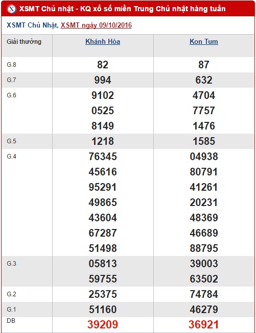 Đến hẹn lại lên, hôm nay chủ nhật như thường lệ xổ số miền Trung sẽ mở thưởng tại các tỉnh Khánh Hòa và Kon Tum. Sau đây, hãy cùng chúng tôi điểm lại tình hình kết quả XSMT lần quay trước Chủ nhật ngày 9/10/2016 !